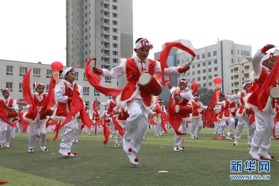 11月4日,蘭州市桃樹坪小學(xué)學(xué)生在活動現(xiàn)場表演歡慶腰鼓。當(dāng)日,甘肅省蘭州市城關(guān)區(qū)學(xué)校體育“一校一品”現(xiàn)場展示活動在蘭州市第五十四中學(xué)舉行,16所學(xué)校進行了特色校園體育項目表演。據(jù)介紹,蘭州市城關(guān)區(qū)現(xiàn)已推廣各類體育項目40余項,命名“體育特色項目示范校”42所。 新華社記者 張智敏 攝