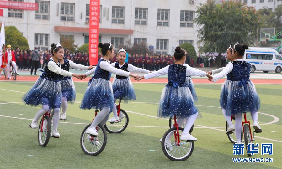 11月4日,蘭州市伏龍坪小學(xué)學(xué)生在活動現(xiàn)場進行獨輪車表演。新華社記者 張智敏 攝
