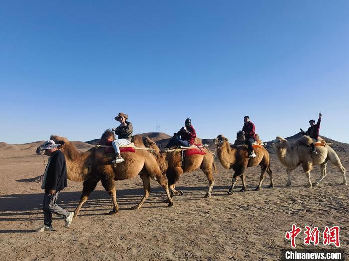 圖為留學(xué)生在陽(yáng)關(guān)景區(qū)體驗(yàn)乘騎駱駝。劉玉桃 攝