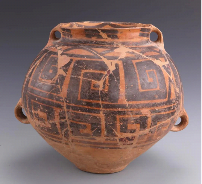 描述:泥質(zhì)橙黃陶,侈口,短束頸,斜肩,垂折腹,平底,肩部有對(duì)稱雙耳,施黑紅彩,口沿內(nèi)飾垂弧紋,頸飾平行條紋,肩飾反向的回形紋,腹部為寬帶紋,其間飾點(diǎn)紋。