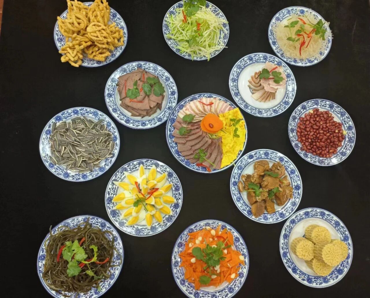 以常見的“十三花”為例,“十三花”,即十二個佐酒涼菜,加一旋菜全盤。整體具有太陽花或旋轉(zhuǎn)八卦意象,遂美稱為“花”。