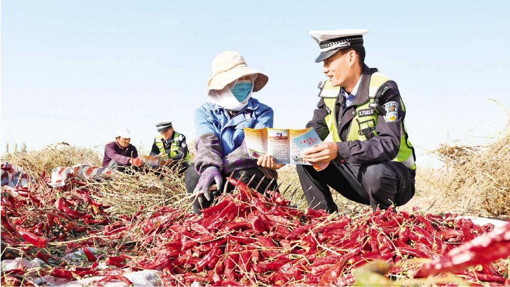 民警在田間地頭向群眾講解交通安全知識(shí)。近日,高臺(tái)縣公安局交通管理大隊(duì)駱駝城交警中隊(duì)民輔警通過發(fā)放宣傳資料、以案釋法、與村民面對面交流等方式,宣傳道路交通安全法律法規(guī),維護(hù)好豐收季節(jié)農(nóng)村道路交通秩序。新甘肅·甘肅法治報(bào)通訊員 蔣雯麗 攝