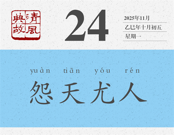 朱熹《論語集注》對(duì)“不怨天,不尤人”的理解要簡(jiǎn)潔得多,也深刻得多:“不得于天而不怨天,不合于人而不尤人。”《荀子·榮辱》則更進(jìn)一層:“自知者不怨人,知命者不怨天。”能夠看清自己的人就不會(huì)去埋怨別人,那么埋怨誰呢,當(dāng)然是埋怨自己了;能夠知道自己命運(yùn)的人就不會(huì)怪罪于天,那么怪罪誰呢,當(dāng)然是怪罪自己了。后世則反“不怨天,不尤人”之意,而以“怨天尤人”為典,形容遇到不稱心的事情,或者事情不順利的時(shí)候,一味埋怨天,一味責(zé)怪別人。言外之意,就是不從主觀上找原因,不在自己身上找問題。宋人李昌齡《太上感應(yīng)篇》:“苛虐其下,恐嚇于他。怨天尤人,呵風(fēng)罵雨。”