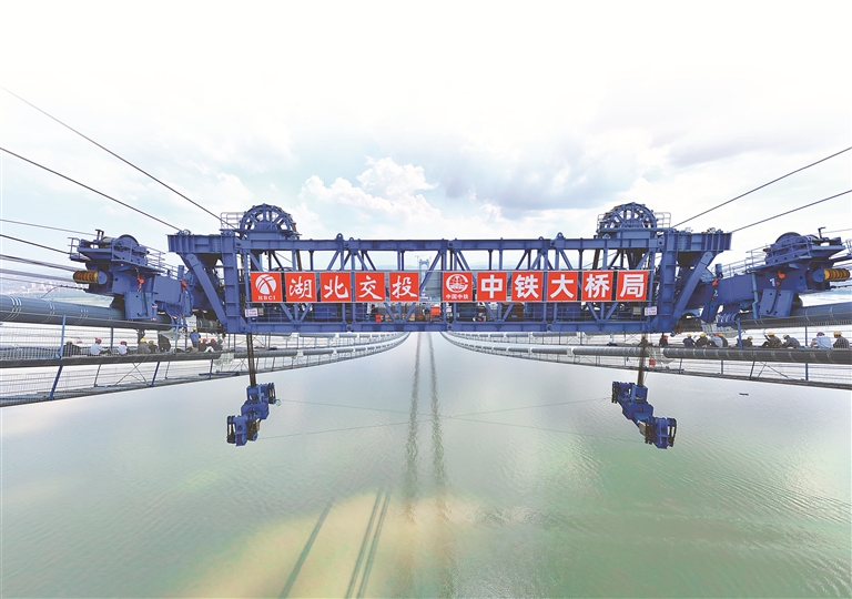 那就自己創(chuàng)造經驗!湖北交投牽頭聯(lián)合承建單位,在大橋建設前期進行了大量數(shù)據(jù)論證和可行性試驗,一次次研究優(yōu)化施工方案。他們堅持設備優(yōu)化與工藝創(chuàng)新“雙管齊下”,應用纜載吊機、液壓提升裝置等裝備創(chuàng)新施工方法,順利攻克了難關。