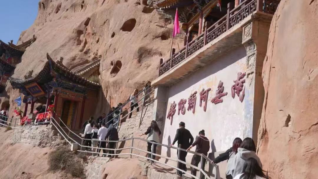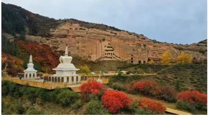 18日上午,迎著耀眼的晨光,采訪團(tuán)成員乘坐大巴車來到了集自然風(fēng)光、石窟藝術(shù)、民族風(fēng)情、宗教文化于一體的肅南馬蹄寺。馬蹄寺是河西走廊著名的佛教勝地,石窟群開鑿于十六國北涼時期,距今約1600年的歷史,是絲綢之路上至關(guān)重要的歷史文化瑰寶,也是我國早期石窟的杰出代表。秋日的馬蹄寺,秋高氣爽,景色宜人,遠(yuǎn)遠(yuǎn)看去,紅綠相間,層林盡染,大家行走在落葉飄零的山間小路上,對這座建在懸崖峭壁之上、將棧道鑲嵌在山體之內(nèi)的石窟充滿了好奇。