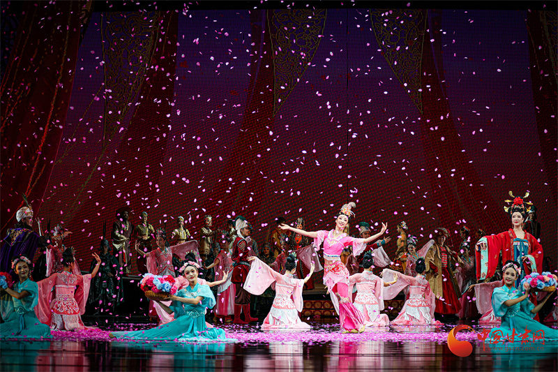 當全息投影將莫高窟壁畫在舞臺上緩緩展開,當駝鈴聲與電子樂編曲交織出跨越時空的和弦,觀眾相信,所謂“傳統(tǒng)”從不是凝固的標本,而是流動的生命,正如劇中穿越千年的花雨,落在古代畫工的筆端,落在當代舞者的袖間,浸潤海內外每一位觀演者的心田。劇中描繪的中外友好通商、民心交融場景,更是對新時代“一帶一路”倡議的生動詮釋。(甘肅省文化旅游廳供圖)