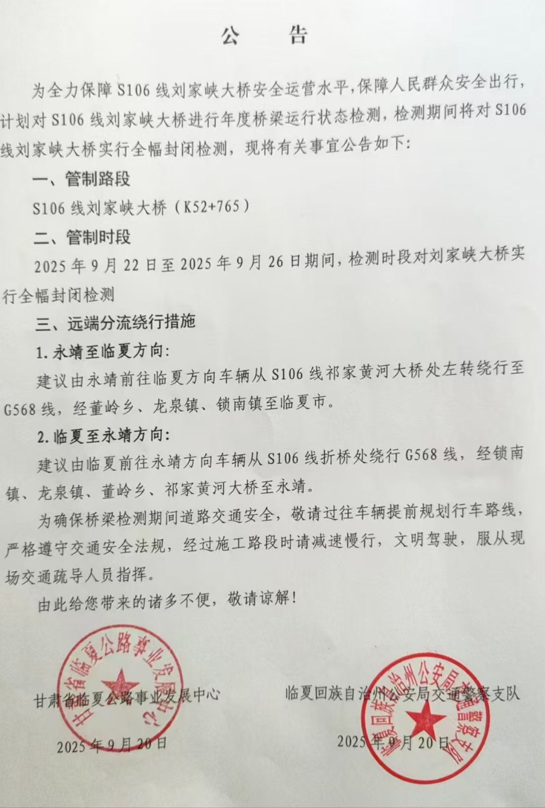 中國(guó)甘肅網(wǎng)9月20日訊(西北角·中國(guó)甘肅網(wǎng)記者 宋芳科 )記者從臨夏州公路事業(yè)發(fā)展中心獲悉,為全力保障S106線劉家峽大橋安全運(yùn)營(yíng)水平,保障人民群眾安全出行,臨夏州公路事業(yè)發(fā)展中心計(jì)劃對(duì)S106線劉家峽大橋進(jìn)行年度橋梁運(yùn)行狀態(tài)檢測(cè),2025年9月22日至2025年9月26日期間,將對(duì)S106線劉家峽大橋?qū)嵭腥忾]檢測(cè)。