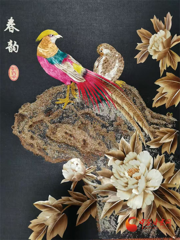 多年打磨后,郭百花走出了獨特的創(chuàng)作之路——以拼貼手法為主,讓作品更具層次感與立體感。在她十幾平米的“百花麥稈藝術(shù)工作室”里,《春韻》勾勒出江南詩意,《敦煌文旅》再現(xiàn)絲路風(fēng)情,《孔雀戲牡丹》盡顯雍容華貴,而《錦上添花》中,小鳥的羽毛竟由細如發(fā)絲的麥稈剪貼而成,市場價達1500元左右。這些作品里,既有山川花鳥的靈動,更藏著通渭的鄉(xiāng)土記憶,平凡麥稈在她手中徹底“化腐朽為神奇”。