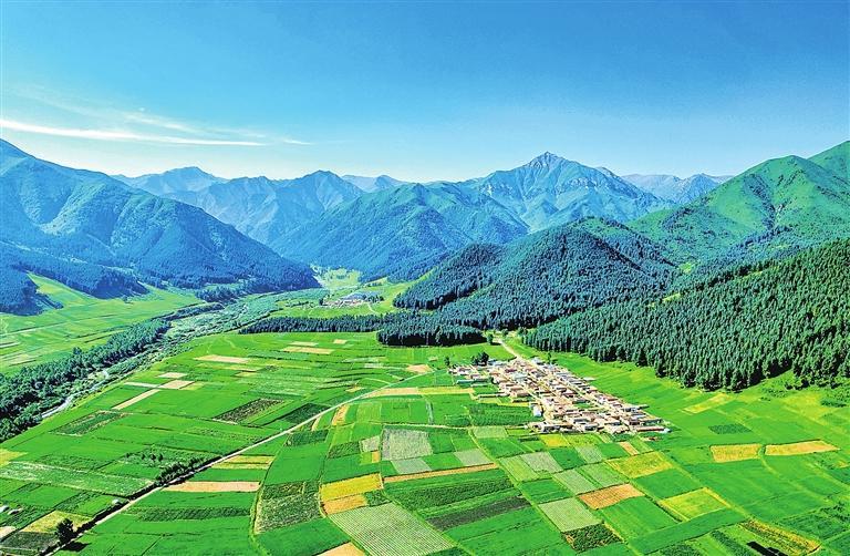 天??h哈溪鎮(zhèn)大尖山溝,林區(qū)、村莊、農田構成美麗畫卷。