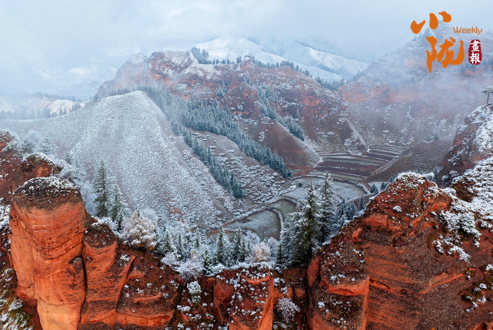如斧劈刀削的赤壁,被冬雪溫柔地描摹,無垠的丹霞赤紅與素潔的白雪同框,赭紅似血、潔白如絮,在大地上展開一幅對比強烈又和諧共存的絢麗畫卷。