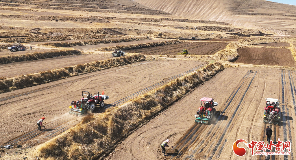 4月3日,張掖市民樂縣5萬多畝制種油菜基地上,種植戶正忙著覆膜、鋪設滴灌帶,并用手扶小型滾輪播種器進行精量播種,田間地頭一派繁忙的春耕景象。