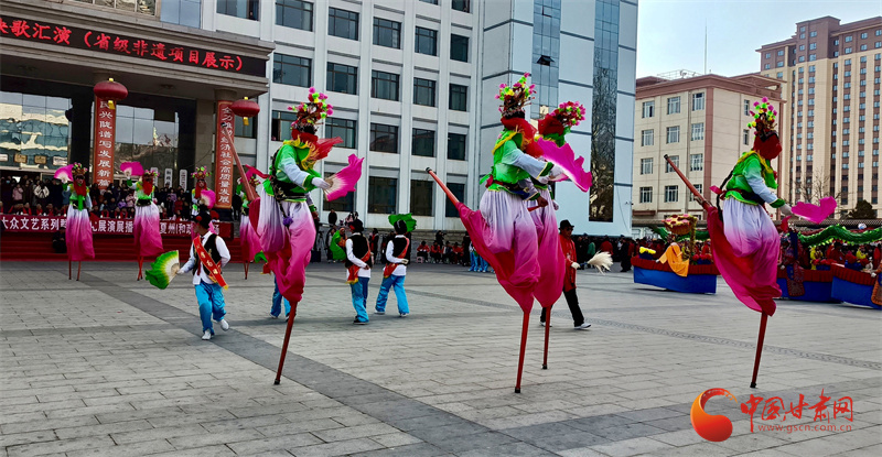秧歌精華盡在“身子”表演。中郎與臘花姐成雙配對,少則十對四十人,規(guī)模隨隊(duì)伍靈活增減,女角腳踩一米以上木制高蹺,彩扇絲巾相映成趣。場地表演“舞花場”節(jié)奏明快、走位繁復(fù),行進(jìn)表演舒緩舒展,男引女隨、穿插盤旋,伴奏《十盞燈》《十二個(gè)月》曲調(diào)悠揚(yáng)。進(jìn)退場時(shí),表演者大步狂舞、彩帶飛揚(yáng),鑼鼓齊鳴、鞭炮喧天,將西北年俗的熱烈奔放推向極致。
