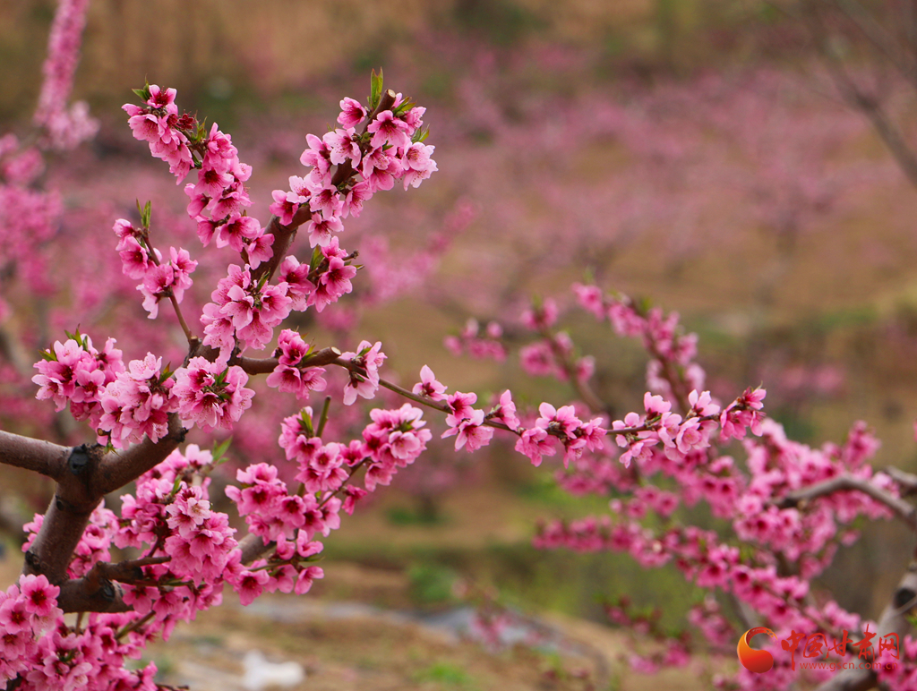 春風(fēng)拂過,桃花競相綻放,粉花滿枝與遠(yuǎn)山交相輝映,宛如一幅詩意畫卷。
