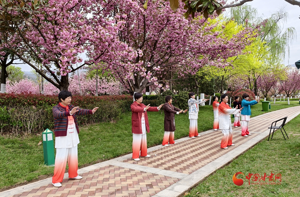4月11日,在金徽酒文化廣場,游客正在打太極。