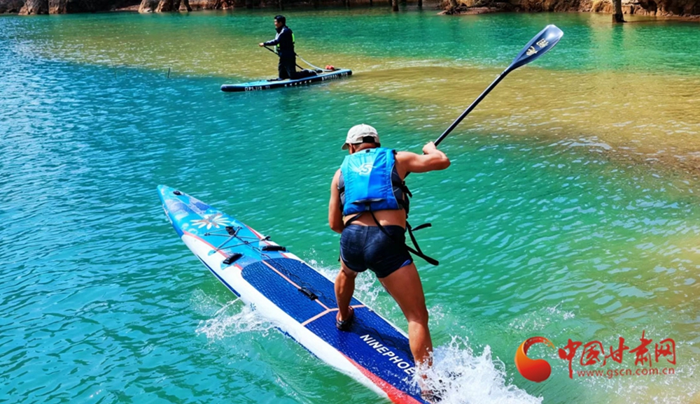 槳板愛好者們立于碧波之上,奮力揮槳,身后是炳靈寺石窟億萬年雕琢的丹霞峰林,是沉淀了1600余年的絲路文明印記。當(dāng)天,永靖縣“‘郁’見黃河·花漾永靖”郁金香文化旅游系列活動(dòng)正式啟動(dòng),炳靈寺水域同步開展槳板文旅活動(dòng),成為本次春季文旅IP的核心亮點(diǎn)。