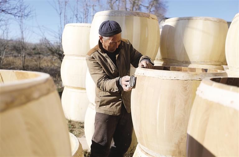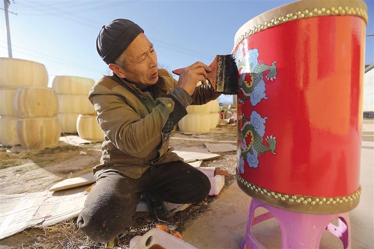 冬日農(nóng)閑時(shí)節(jié),在甘肅省定西市安定區(qū)鳳翔鎮(zhèn)北廿鋪村,牛皮鼓手工制作藝人利用晴好天氣趕制訂單牛皮鼓,供應(yīng)市場。該村每年可制作各類牛皮鼓3000余面,牛皮鼓手工制作涵蓋選材、解板、刨制鼓腔、蒙皮、釘釘?shù)榷嗟拦ば颍俳?jīng)數(shù)天晾曬和反復(fù)調(diào)試才能最終制成。牛皮鼓是我國的傳統(tǒng)打擊樂器,在西北地區(qū)用于民間社火表演等活動(dòng)。