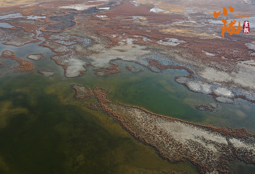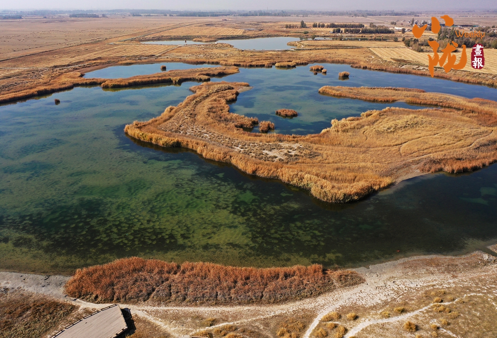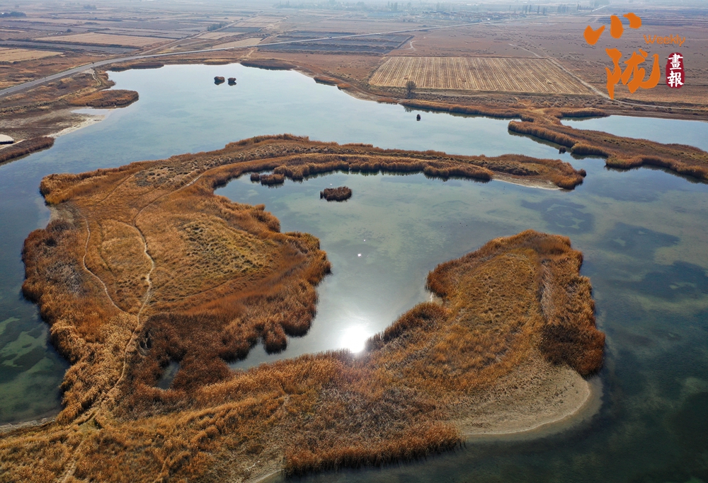 濕地安然舒展在沙海與蒼穹之間,仿佛大地的眼眸。它與蒼茫四野悄然融合,共同勾勒出一幅“水漾金沙,色染冬暝”的自然水墨。