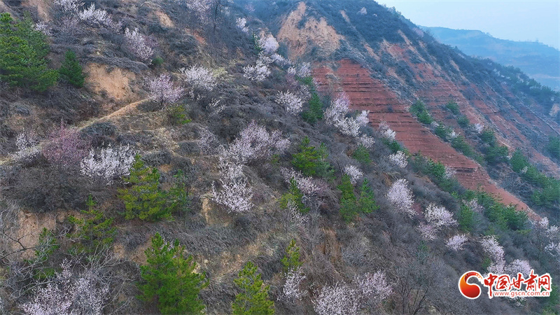 桃花朵朵開,如粉色綢帶纏繞在翠綠山間