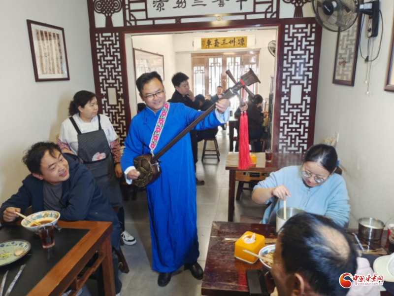 當(dāng)日,北關(guān)市場內(nèi)人流如注、熙熙攘攘,眾多游客與市民齊聚于此,享受美味的同時(shí)觀看涼州賢孝和永昌滾燈,涼州賢孝傳承人賈旭峰與用餐的游客進(jìn)行了互動(dòng),人們安逸地享受著這份獨(dú)具涼州特色的煙火美味。